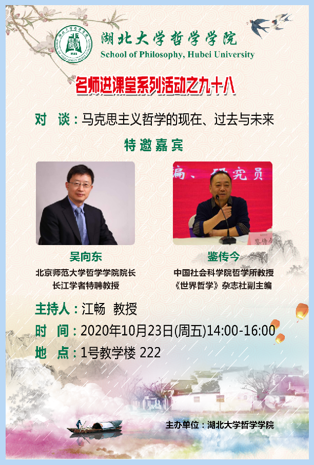 20201023日星期五下午两点,公司于1号教学楼222教室举行了主题为“马克思主义哲学的现在、过去和未来”的对谈性讲座。此次讲座由江畅教授主持,北京师范大学WilliamHill体育经理、国家级计划入选者特聘教授吴向东教授及《世界哲学》杂志社副主编、中国社会科公司哲学所鉴传今教授应邀出席讲座。出席此次会议的还有公司党委书记戴茂堂教授、陶文佳讲师,以及华中科技大学副教授林季杉老师。公司部分硕士和博士也积极地参与了这次讲座。