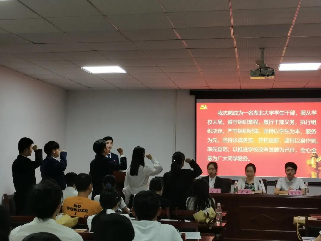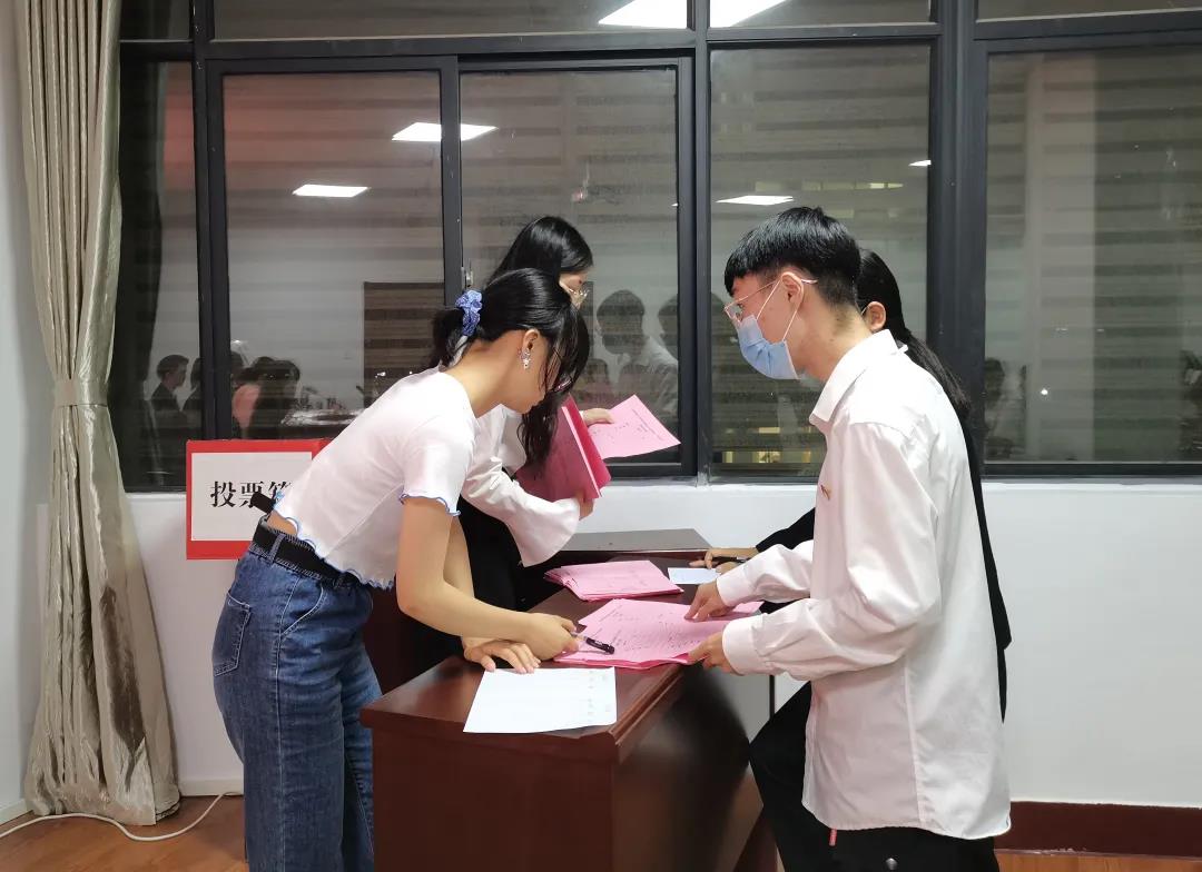 在总监票人确认投票有效后,经过现场统计,向大会代表报告了投票结果。最终,由张涵、者淇当选第十九届团委副书记,由杨梓欢、冯皓洋、李雨欣当选第十九届主席团成员,在当选者依次示意后进入宣誓就职环节。