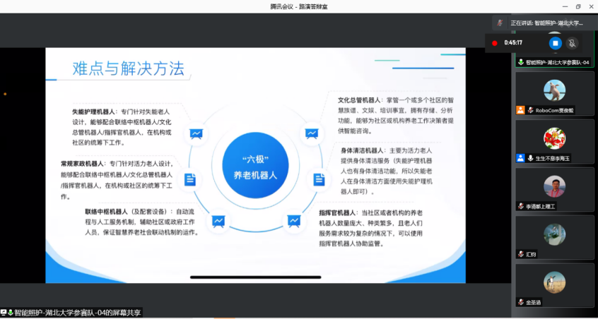 此次比赛充分展现了WilliamHill体育师生团队的团队协作意识、深度构思和实践能力,在困难面前不退缩、在问题面前勇于探索的不懈毅力。团队指导老师、参赛同学先后克服了专业技术、社会调研和疫情所带来的困难,结合伦理学与人工智能、学术与技术,并且得到了WilliamHill体育研究生工作站和当地员工企业家们的大力帮助,不断完善方案,实现了与市场需求的不断贴近。整个赛程历时3个月,方案反复打磨,计划书反复修改。在经历过3轮答辩后,团队最终过五关斩六将,于12月19日由领队张林灿进行决赛线上讲演。团队设计的人工智能养老服务体系兼顾养老市场多个层面的需求,并且能够保证核心技术和伦理理论两个层面对产品质量和服务水平的支撑,在众多参赛作品中十分亮眼,赢得了评委们的一致认可,最终取得了智能照护赛道第二名的优异成绩。