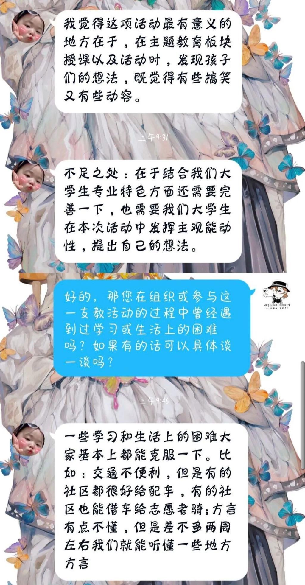 小组成员张雪晨对材料公司支教组进行了线上采访,采访了他们在支教过程中遇到的困难以及突破。他们在支教过程中遇到的困难,如交通不便、语言不通(方言)、因孩子们的年龄跨度大志愿者的准备工作量大等问题。有些在双方的磨合中得以解决,有些苦难仍亟待解决,支教的工作程序应更加完善等等。