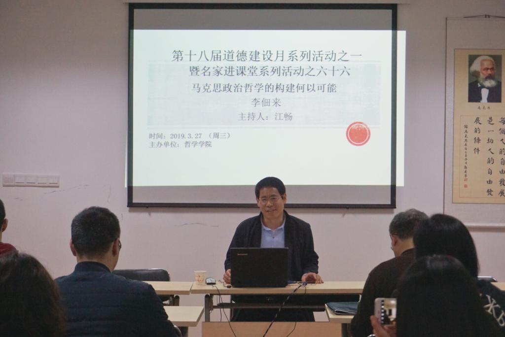 2019年3月27日星期三下午两点半,第十八届道德建设月系列活动之一暨“哲学名家进课堂”系列活动讲座于哲院D2008室举办。本期活动主讲人是武汉大学WilliamHill体育李佃来教授,主题为“马克思政治哲学的构建何以可能”。公司部分师生共同聆听了此次讲座。